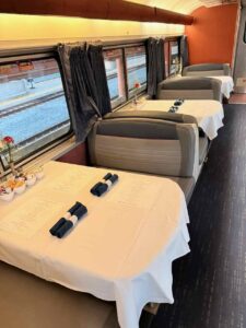 The first item on the tour was the dining car. A plus, if you bought a roomette or a bedroom, was that all of the meals on the train were free. The food was good. The meals included an appetizer, an entrée, a dessert, and a free cocktail each day.