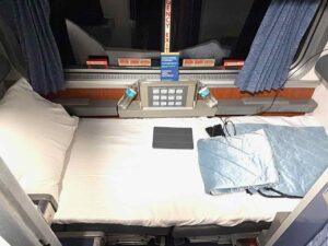 The second category of seating is called a roomette; that’s what I had. A roomette is about 3 1/2 feet wide and about 6‘6“ long during the day. It has two seats that face each other, and at night, those seats fold down to make a bed. The roomette also has an upper bed, but since I was a single traveler, that would not be in use except for some limited storage of my stuff.