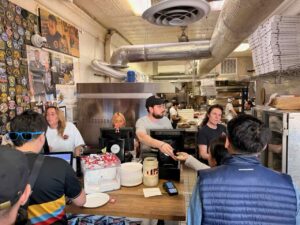 As the reviews expected, people were waiting in line not only to order their cheesesteaks and pizza but also to pick them up. I waited in line for about 10 minutes to place my order for the 11-inch cheesesteak, the only size offered, with sharp cheese and onions. I was told it would take 30 minutes to get my “steak.”