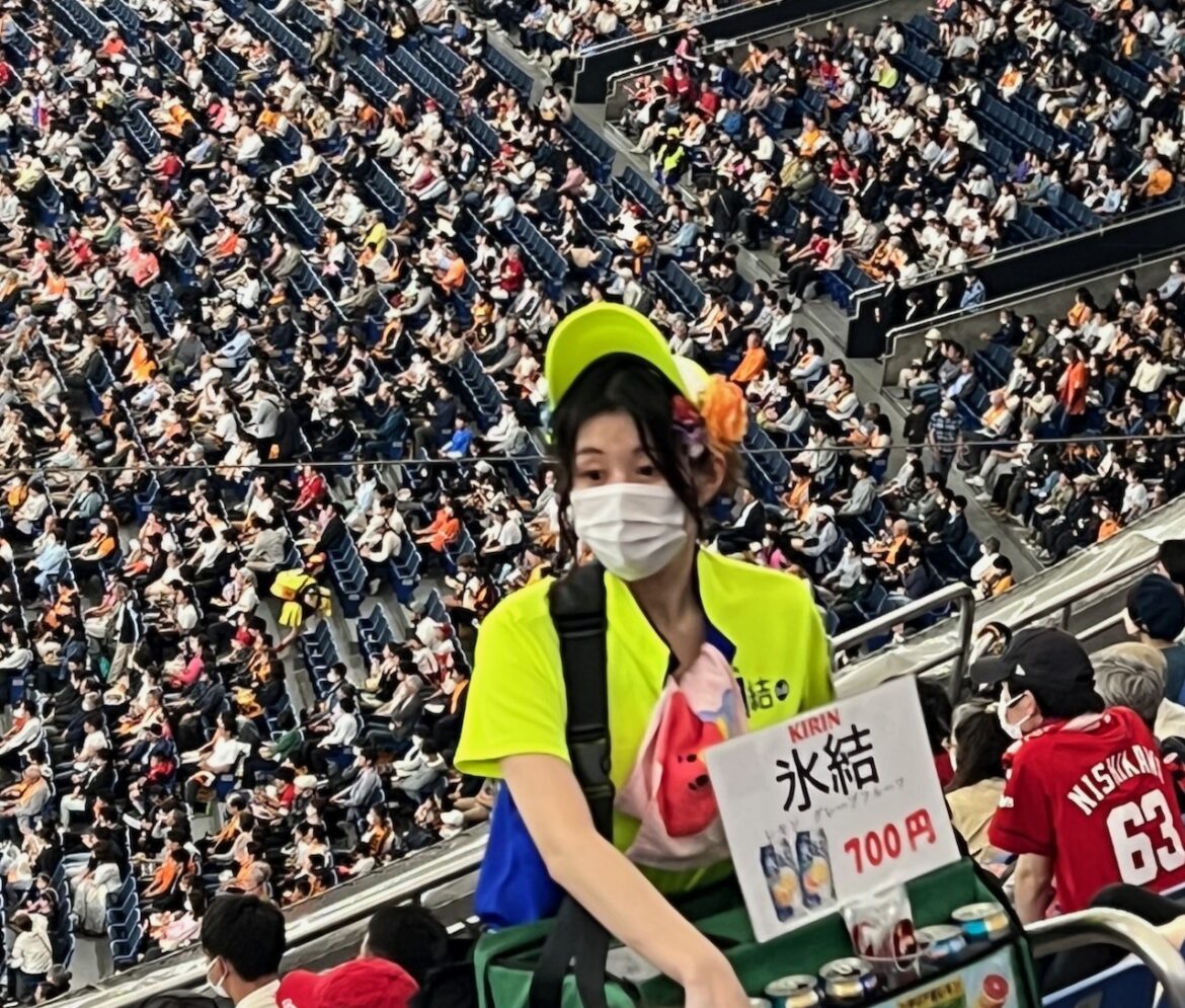 These games have vendors going through the stands. That’s not unusual by itself. However, in Japan, ALL of the vendors are young women. I’m talking about literally hundreds of young Japanese women who are small, young, attractive, and probably weigh 95 pounds on average. These women swarm the stadium, running up and down the steps with huge coolers/containers on their backs. What’s in the container? Beer. These women are selling beer in almost every circumstance.